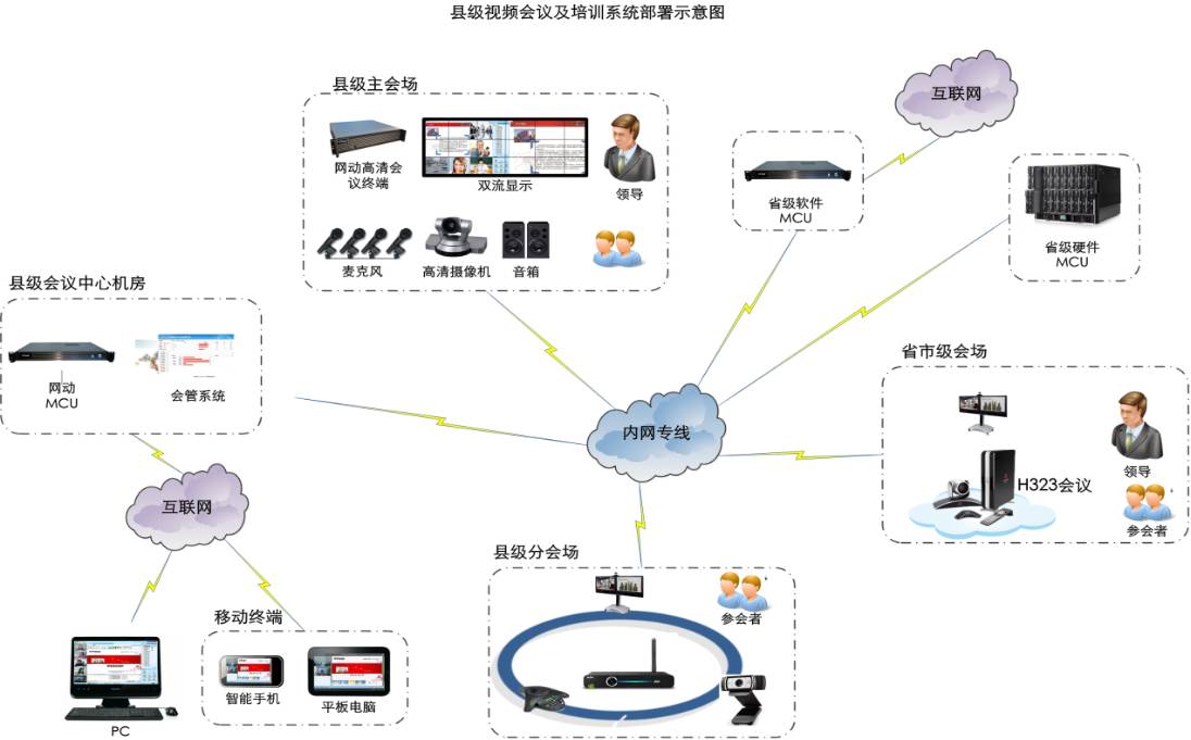 县级会议:组织召开县级会议和培训时,直接使用通过县级网动MCU平台进行,无需借助省市级硬件设备和网络;